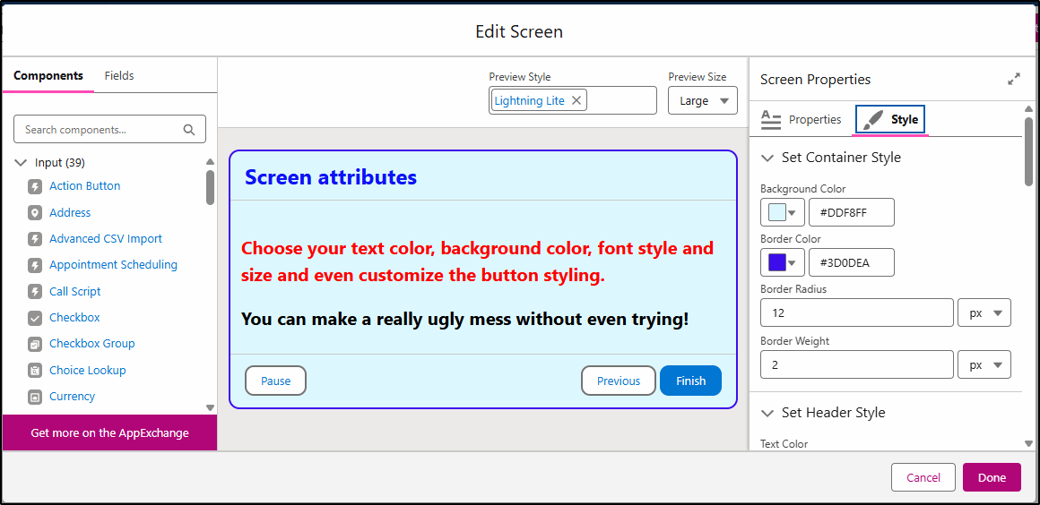 In Spring ’26, you can start to apply more styling to screen flow automations. Customize the background, border color, border radius, font type, size, and color, and adjust the shape of the Next, Previous, and Pause buttons. You can also apply attributes to the buttons when you hover over them or select them, too. Use these features to apply your corporate colors and styles to screen flow automations.