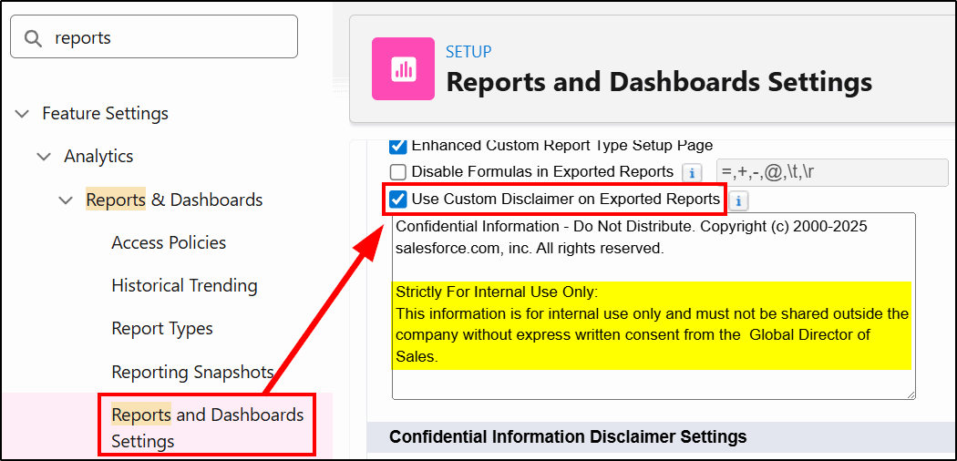 While you can’t replace the standard Salesforce disclaimer on report, (or easily prevent the export of reports) you can now add a custom message to make it very clear what your company policy is with regard to sharing the information contained in reports extracted from Salesforce.