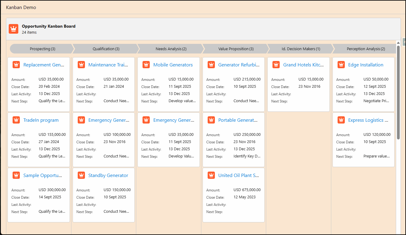 Adding the new Kanban Board component to a screen flow enables you to have greater control over how you visualize Salesforce records. Include up to five (5) fields and include both header and footer fields.