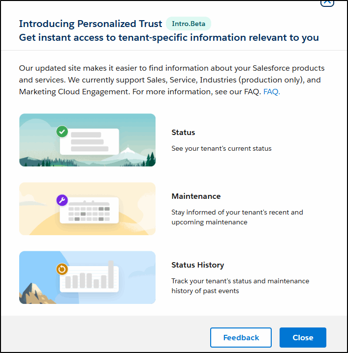 A more personalized version of trust.salesforce.com, the my.trust.salesforce.com brings together the relevant ongoing Events, Maintenance, and Status History, along with additional tabs for Tenant and Subscription information too, allowing you to view them all in one place.
