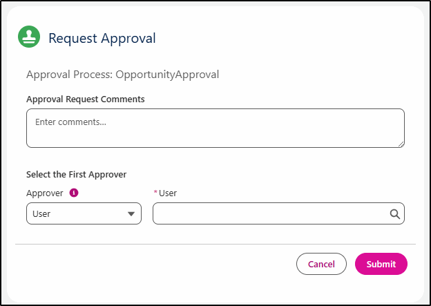 Missing from the new Flow based approval process was a component to add to a Lightning Page that allowed the end user to submit a record for approval (without having to create custom buttons). This has now been delivered in Spring ’26 with the Request Approval component that you can add to Lightning Record Pages. This allows you to hide/show the comments from the submitter and can also prompt the user to select the first approver.