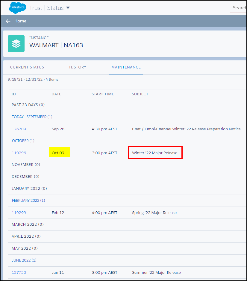 They click this link and are taken to a page that shows the current status of the Walmart Salesforce instance. When this was checked on 18 Sept, 2021, they can see that this instance has not been upgraded yet, it is still running Summer ’21.