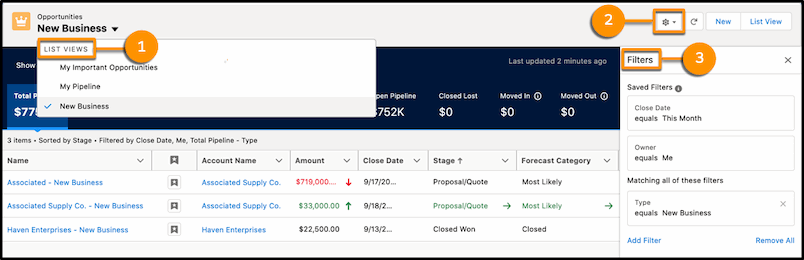 Help manage your pipeline of opportunities with new features including: custom pipeline view and filters, the ability to flag and track important deals, using Einstein Deal Insights to predict which deals will not close this month, tiered Opportunity scores, indicators to show when next steps have not been updated and a push count field to show the number of times the close date have been pushed out.