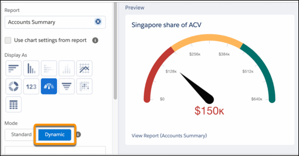 Dynamic Gauge Charts now allow you to adjust the graduations in the chart using values from Salesforce records and not static values, allowing KPI’s to respond dynamically to your business. No more having to manually set these static values!