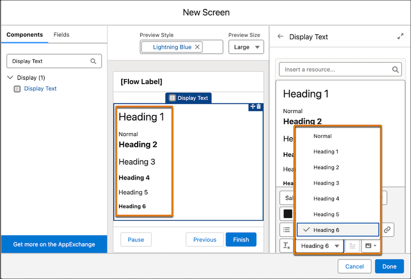 Make Text in Display Text Components More Readable and Accessible. In Screen flows, you can make your text more readable and accessible by applying standard heading and paragraph styles.