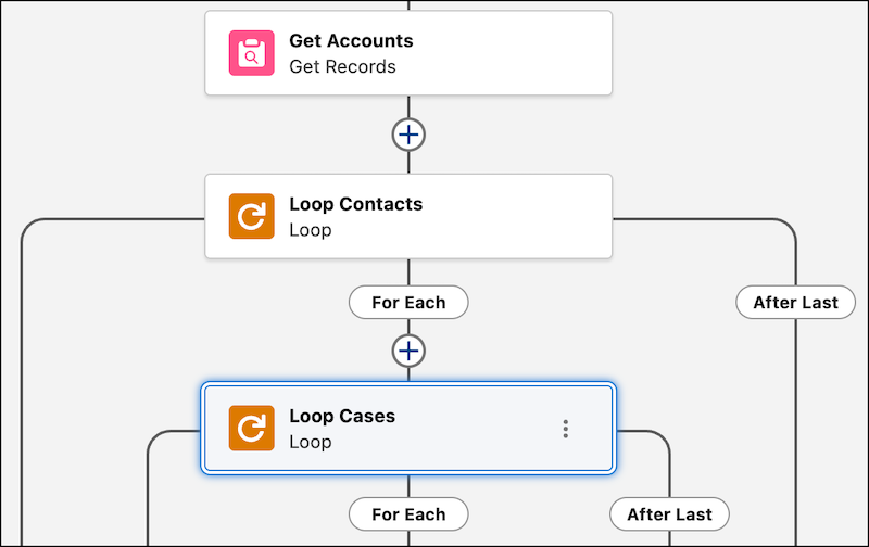 A new (beta) feature extends Get Related Records and allows for nested loops of related records. For example, get related records for an account, all related team members, and their related cases. With nested loops, you can iterate through each team member, and then for each team member, iterate through all their related cases.