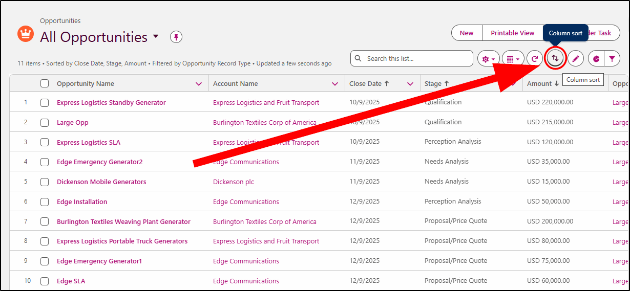Note: It’s not available on every object just yet, so look for the Column sort icon on list views as shown below: