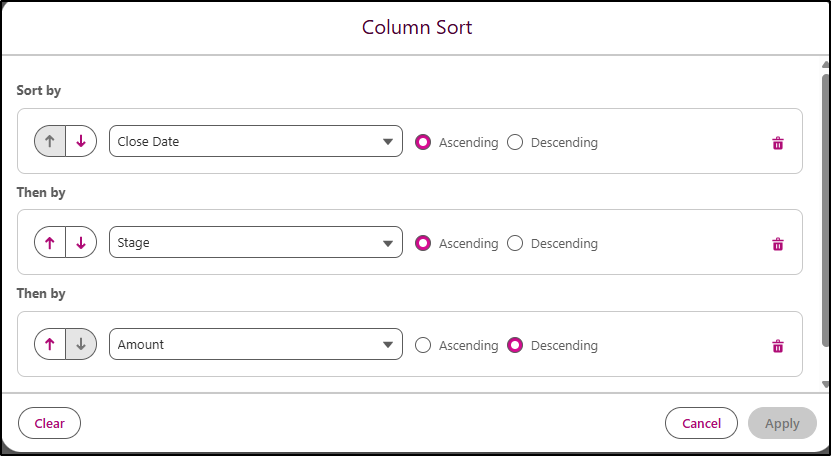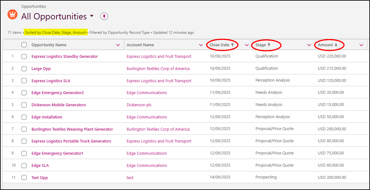 Sales reps working on opportunities can now sort them by Close Date, Stage, and Amount to provide better work guidance. Up to 5 columns can be selected with a mix of ascending or descending sort order on each column. The sort order is also displayed in the list view header.