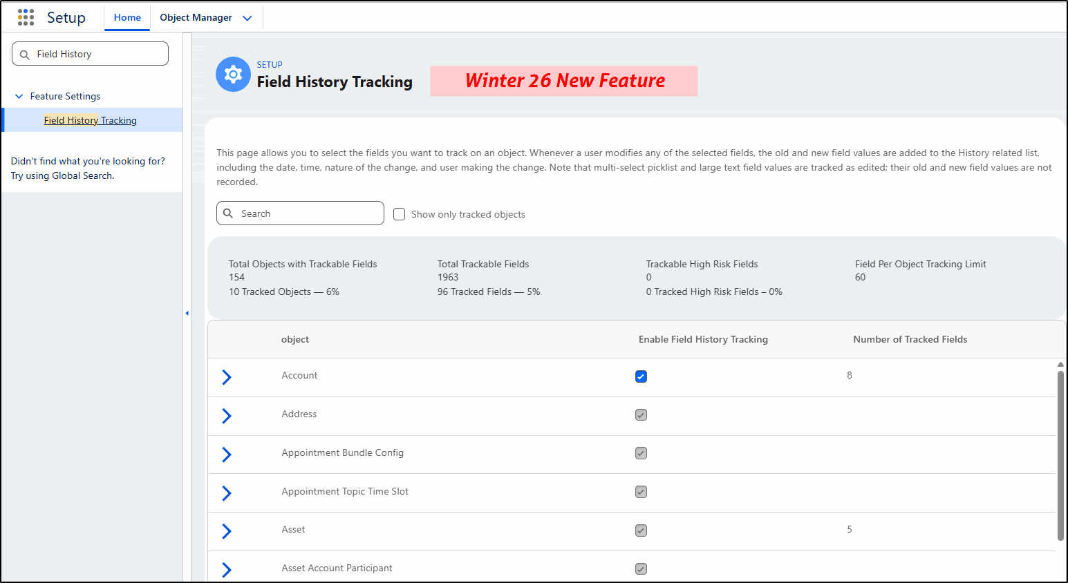 Field History Tracking is the feature that provides a log of changes made to a record and is shown on the “History” related list for a record. Configuring this has now been made much simpler. Instead of having to edit each object, there is a new feature under Setup -> Field History Tracking that will allow you to select and configure fields to track on all objects in one place. This will be a huge time saver!