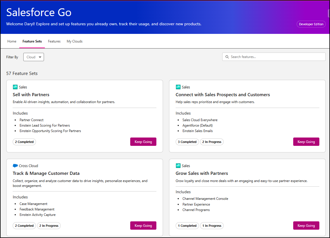 Salesforce Go is the revamped setup home page where you can explore and set up features you already own, track their usage, and discover new products. It has been enhanced to include more cloud environments and includes training resources to help set up features. Where features have prerequisites, these are automatically enabled too.