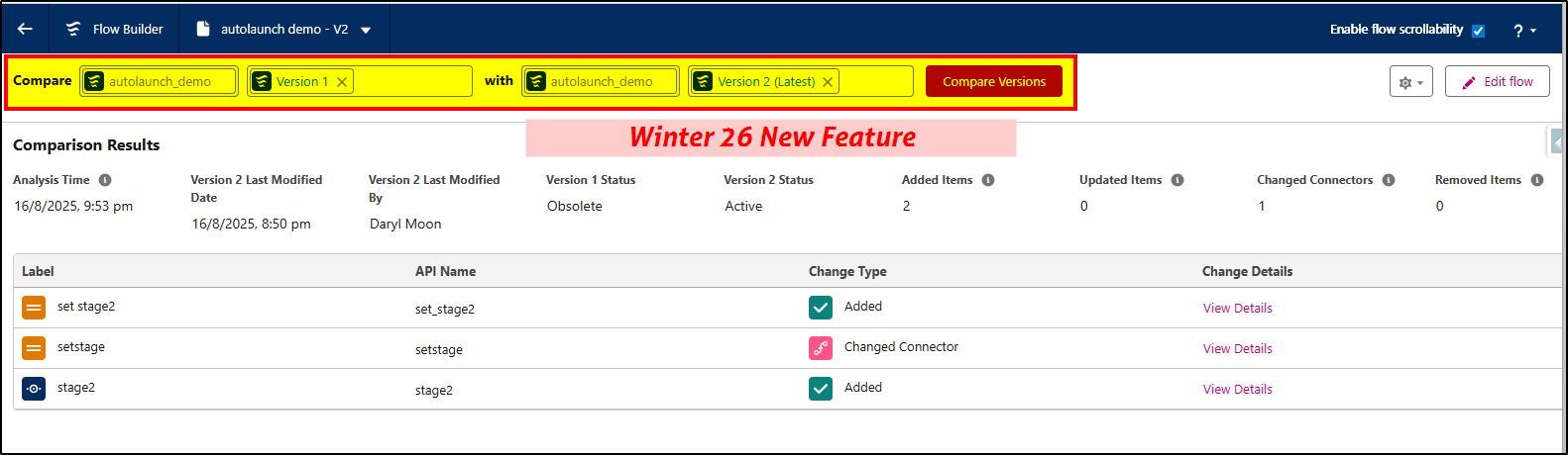 In the Salesforce Winter ‘26 release, you will have a Flow Comparison feature to allow you to select and compare two flows side-by-side. Supported flow types include Record Triggered, Scheduled, and Auto Launched flows. Screen flows are not yet supported.